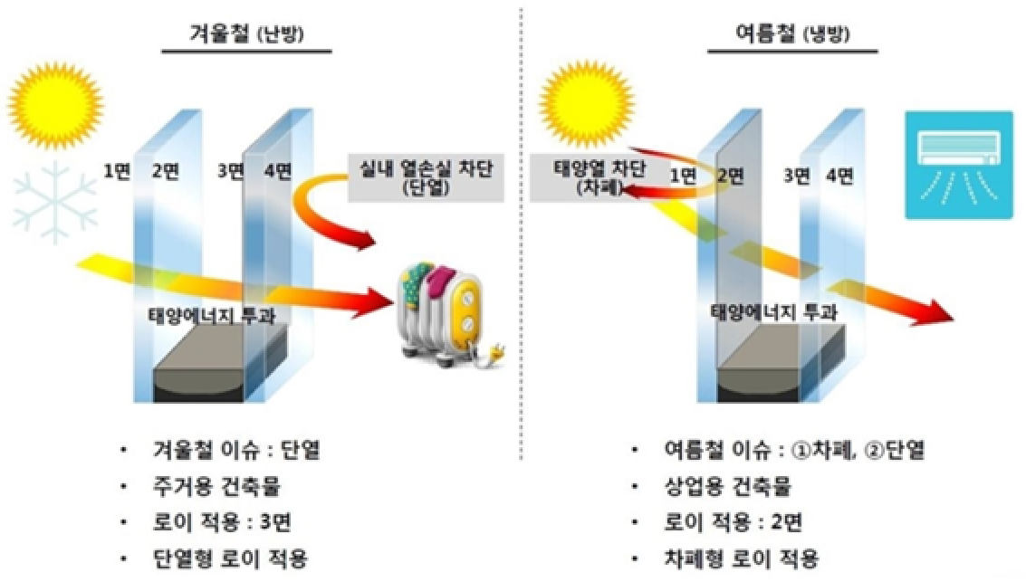 주거용 건물은 저녁 시간대의 주 생활공간으로서 냉방보다 난방 효율에 초점을 두는 반면 상업용 건물은 낮 시간에 인구 유동이 많아 난방보다는 냉방 효율에 초점을 맞추기 때문에 태양열을 얼마나 잘 차단할 수 있는가가 중요하다.